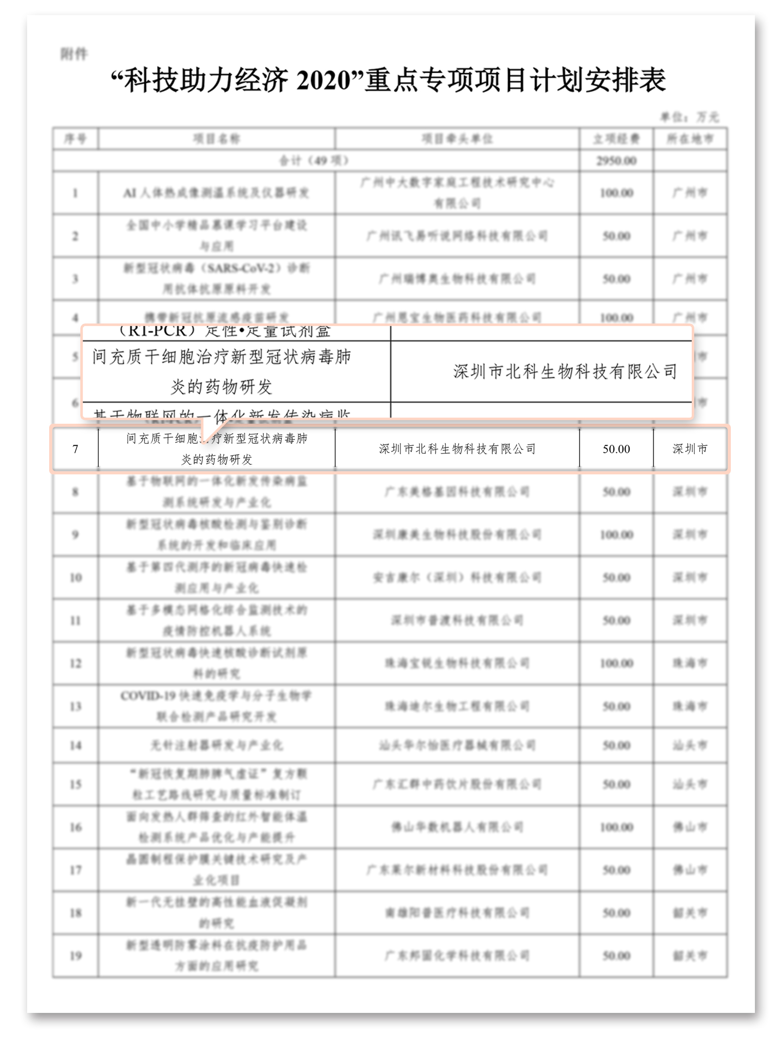 日前,由科技部支持的一批覆蓋國民經(jīng)濟(jì)主要行業(yè)的技術(shù)創(chuàng)新項(xiàng)目陸續(xù)“揭榜”,廣東省科技廳正式發(fā)布了《廣東省科技廳關(guān)于下達(dá)2020年“科技助力經(jīng)濟(jì)2020”重點(diǎn)專項(xiàng)項(xiàng)目計(jì)劃的通知》,其中深圳市北科生物科技有限公司(以下簡稱“北科生物”)牽頭的《間充質(zhì)干細(xì)胞治療新型冠狀病毒肺炎的藥物研發(fā)》成功入選,獲“廣東省科技助力經(jīng)濟(jì)2020”重點(diǎn)專項(xiàng)推薦項(xiàng)目。