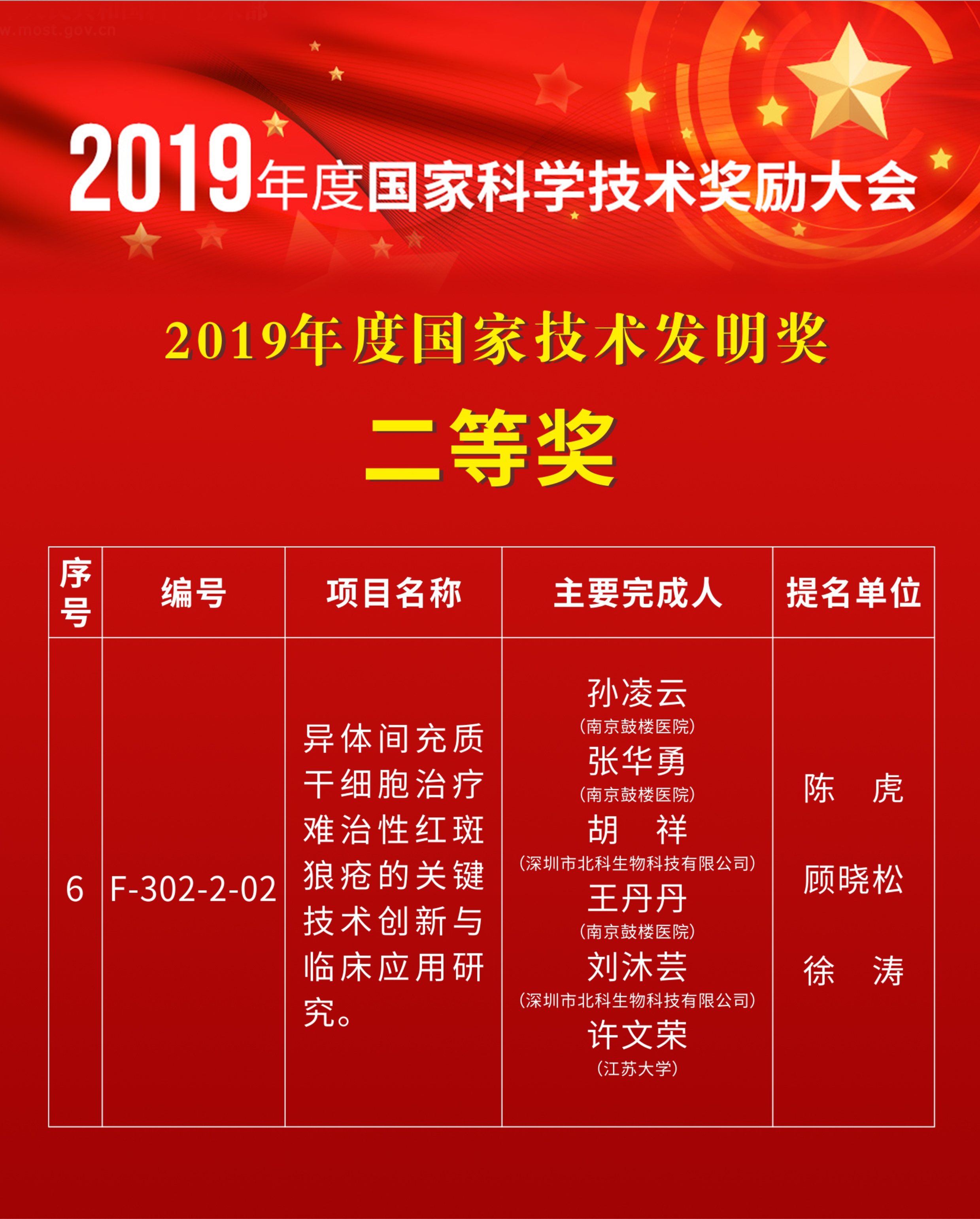 2020年1月10日,中共中央、國務(wù)院在北京舉行2019年度國家科學技術(shù)獎勵大會,這是科技界一年一度的盛宴,是中國科技界的最高榮譽,是黨和人民對科技工作者的最高褒獎。南京大學醫(yī)學院附屬鼓樓醫(yī)院風濕免疫科孫凌云,張華勇,深圳市北科生物科技有限公司胡祥、鼓樓醫(yī)院王丹丹、北科生物劉沐蕓、江蘇大學許文榮等共同完成的成果“異體間充質(zhì)干細胞治療難治性紅斑狼瘡的關(guān)鍵技術(shù)創(chuàng)新與臨床應(yīng)用研究”榮獲國家技術(shù)發(fā)明二等獎。