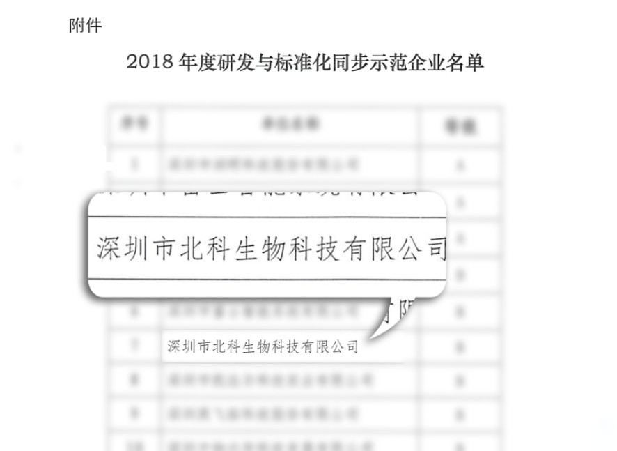2019年02月20日,深圳市市場(chǎng)監(jiān)督管理局發(fā)布的深市監(jiān)[2019]41號(hào)文件,深圳市北科生物科技有限公司(以下簡(jiǎn)稱(chēng):北科生物)榮獲“研發(fā)與標(biāo)準(zhǔn)化同步示范企業(yè)”稱(chēng)號(hào)。