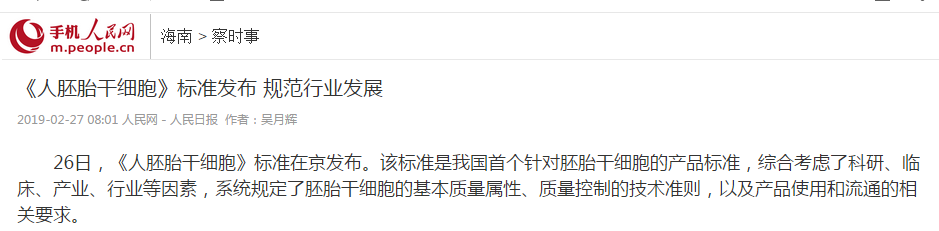 2019年2月26日,《人胚胎干細(xì)胞》標(biāo)準(zhǔn)在京發(fā)布。該標(biāo)準(zhǔn)是我國首個(gè)針對(duì)胚胎干細(xì)胞的產(chǎn)品標(biāo)準(zhǔn),綜合考慮了科研、臨床、產(chǎn)業(yè)、行業(yè)等因素,系統(tǒng)規(guī)定了胚胎干細(xì)胞的基本質(zhì)量屬性、質(zhì)量控制的技術(shù)準(zhǔn)則,以及產(chǎn)品使用和流通的相關(guān)要求。