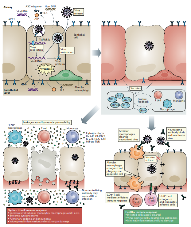 2019年底爆發(fā)的新型冠狀病毒,是一種人群普遍易感的病毒類型,以肺部病變?yōu)橹?,感染特征為發(fā)熱、干咳、氣促、肺部有炎癥性改變等。由于對新冠病毒感染缺乏有效的治療藥物,臨床主要依靠對癥支持治療為主,部分患者在肺炎進入進展期后,容易發(fā)生急性呼吸窘迫綜合征而危及生命。而由于自身免疫細胞識別并攻擊病毒,重癥患者體內可能會誘發(fā)強烈的免疫反應,肺部出現(xiàn)多種且大量的炎癥細胞因子,體內免疫平衡破壞,最終導致肺部器官嚴重損傷,出現(xiàn)嚴重的呼吸障礙(圖1)。